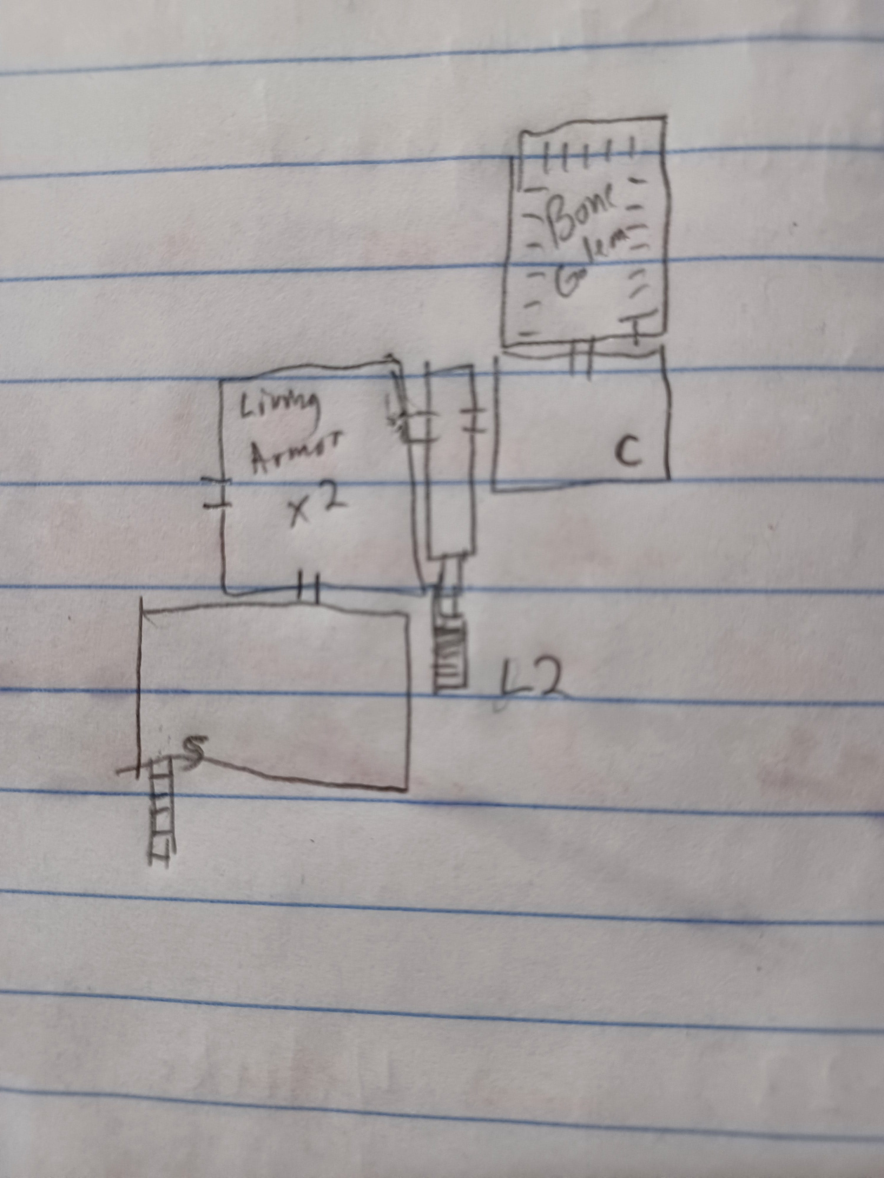 Cybela enteres a large room filled with a pile of bones. She can see the glint of her lamplight from coins among the pile. Shuffling about the room are two sets of living armor. Cybela has no wish to tangle with those beasts, so she sneaks up to the coins, and deftly puts them in her pouch, she then proceeds to the door in the south of the room and tries the handle…